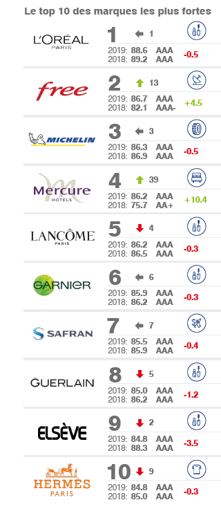 "Avec un score de 88,6, en légère décroissance, la force d’une marque reste un facteur déterminant de la valeur d’une entreprise, au-delà des prévisions de revenus", note Brand Finance. En s’appuyant sur des critères comme l’image de la marque, l’investissement marketing et leurs impacts sur la performance des groupes, le premier cabinet de conseil indépendant au monde en évaluation de marques, a dressé un top 10 des marques françaises les plus puissantes actuellement en notant leur force sur 100. A ce jeu, le luxe remporte la mise avec L’Oréal en tête du classement, Lancôme au 5ème rang ou encore Hermès à la dixième place. Du côté des télécoms, Free étonne en passant de la 13ème à la seconde place cette année. L’opérateur de Xavier Niel est le seul parmi ses rivaux à apparaître dans ce top.