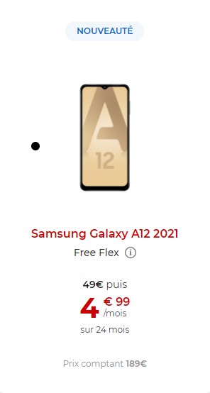 Il s’agit du smartphone Samsung Galaxy A12 2021 affiché à 189 euros au comptant. Il est également possible de l’acquérir via l’offre Free Flex pour 4,99 euros par mois pendant 24 mois, après un premier paiement de 49 euros. L’option d’achat à l’issue des 24 mois s’élève à 20 euros.