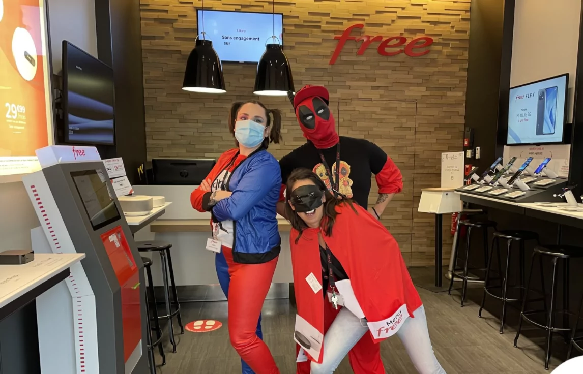 Comme chaque année les Free Centers participent à leur manière à la journée “j’aime ma boîte”. Après s’être transformés en 2018 en jardins éphémères, puis avoir porté des tee-shirts floqués de messages sur le durable et la culture d’entreprise, les conseillers des boutiques de Free se sont déguisés hier en super-héros.