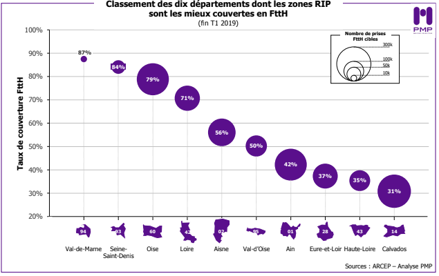 A partir de la publication des chiffres de l’ARCEP concernant le déploiement de la fibre au 1er trimestre 2019, le cabinet PMP a réalisé un état des lieux et une analyse des déploiements de la fibre optique (FttH) en France. Il a mis ainsi en graphique l’avancement de ce déploiement dans les départements les plus actifs, que ce soit en zone AMII (zone moyennement dense) où Free co-investit avec l’opérateur historique, que sur les RIP, où Free a signé avec la quasi-totalité des opérateurs d’infrastructures (retrouvez l’interview réalisée par Univers Freebox)