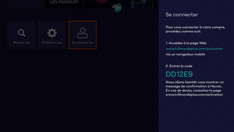Pour utiliser ce sésame, il faudra ensuite se rendre sur la page https://www.tv5mondeplus.com/activation depuis le navigateur Web, se connecter (avec votre compte, Facebook, Google ou Twitter) et entrer le code indiqué sur le téléviseur. Vous voilà connectés.