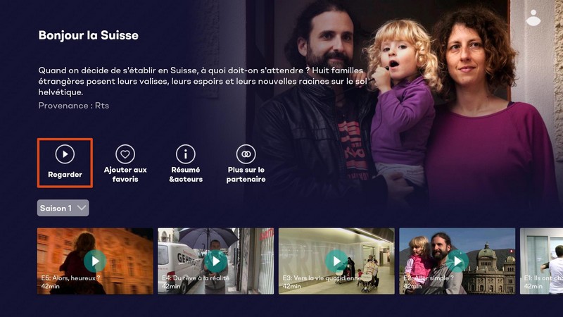 La page descriptive affiche le titre, la durée et le synopsis. En dessous se trouvent les boutons de lecture, de mise en favoris et de résumé des acteurs (selon les contenus, un bouton “Plus sur le partenaire” peut apparaître). Il y a enfin un bandeau de contenus.