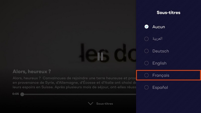 Pour les contenus proposant des sous-titres, il suffira d’appuyer sur le flèche du bas pour afficher les langues disponibles dans un petit encart sur la droite de l’écran.