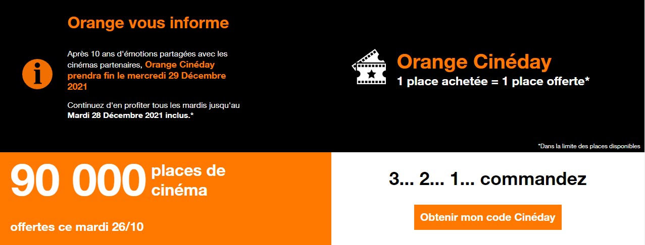 Lancée en 2011, l’offre Cinéday permet pour rappel aux abonnés Orange de profiter chaque mardi d’une place de cinéma offerte pour une place achetée. Elle était disponible pour l’ensemble des abonnés de l’opérateur, avant d’être progressivement réservée à certains forfaits afin de limiter les abus. La tentation était en effet trop grande pour certains de revendre leurs codes sur Internet.