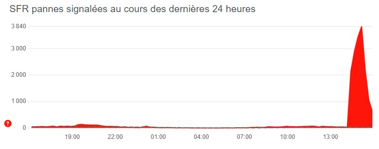 D’après l’outil DownDetector, de nombreux abonnés SFR ont remonté un dysfonctionnement avec leur connexion fixe ou mobile. Les problèmes ont commencé à être signalés peu après 14h00, avec un pic (3840 rapports) aux alentours de 15h00.