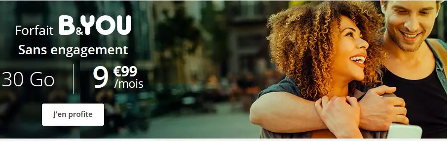Puis on trouve le forfait B&You 30 GO (utilisables en Europe et dans les DOM) à 9,99 euros par mois incluant les appels, SMS et MMS en illimité.