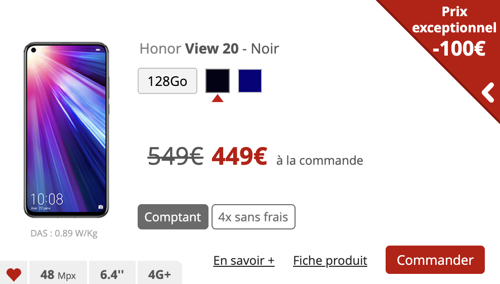 Avis aux abonnés Free Mobile. Compatible avec la bande de fréquence 700 MHz (28), le Honor View 20 est actuellement affiché à 449 euros au lieu de 549 euros en achat comptant soit une remise de 100 euros. Le smartphone haut de gamme du fabricant chinois est également accessible en 4 fois sans frais, soit 113€ à la commande puis 3 fois 112€. A noter que ce flagship est disponible en version 128 Go (bleu et noir). Il n’est cependant pas précisé jusqu’à quelle date cette offre est disponible.