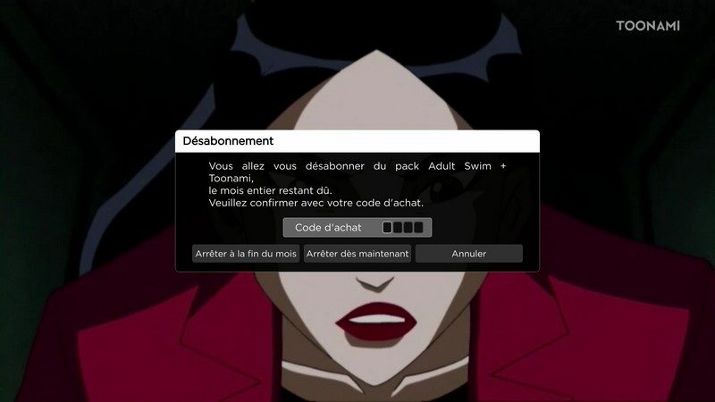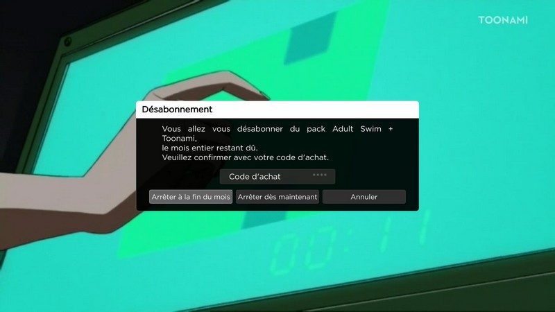Là encore, il faudra saisir le code d’achat et choisir le moment d’arrêt. Une pop-up s’affichera en haut à droite dans la foulée pour vous confirmer la désinscription.