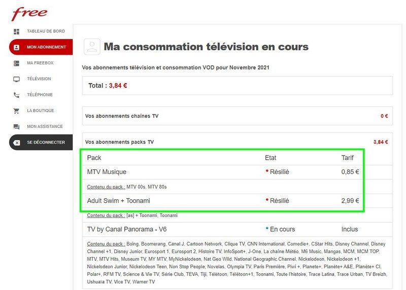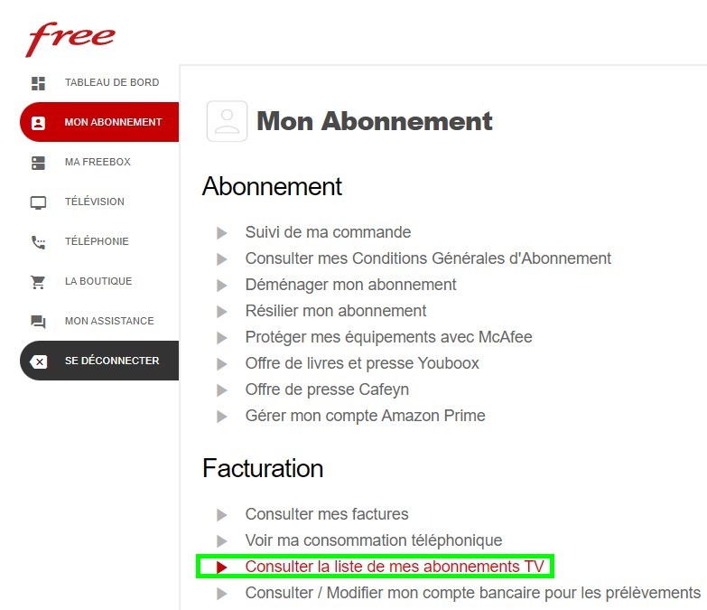 Pour vous assurer de la bonne prise en compte de vos désabonnements, vous pourrez aller dans l’espace abonné Freebox, accessible à cette adresse. Allez dans “Mon abonnement”, puis “Consulter la liste de mes abonnements TV”.