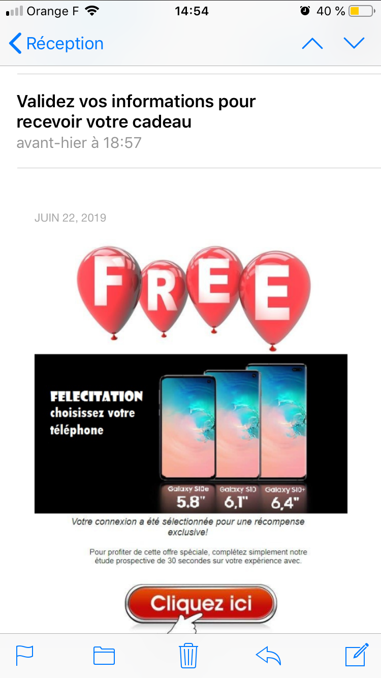 Si parfois, ces phishing sont bien réalisés et sèment le doute, souvent le piège tourne au ridicule. C’est le cas cette semaine avec un hameçonnage plus que raté. Univers Freebox a reçu un mail en provenance d’une adresse farfelue se voulant être Free Mobile, dans lequel nous apprenons que "notre connexion a été choisie pour une récompense exclusive", soit au choix un Samsung Galaxy S10e, S10 ou S10 +. Pour cela, ce filoutage nous propose de répondre à "une étude prospective de 30 secondes." Si ce type d’entourloupe est courant, le visuel flirte avec l’absurdité. Le logo utilisé diffère totalement de celui de Free, pire encore, celui-ci est intégré dans quatre ballons, laissant aucun doute sur la nature de ce mail.