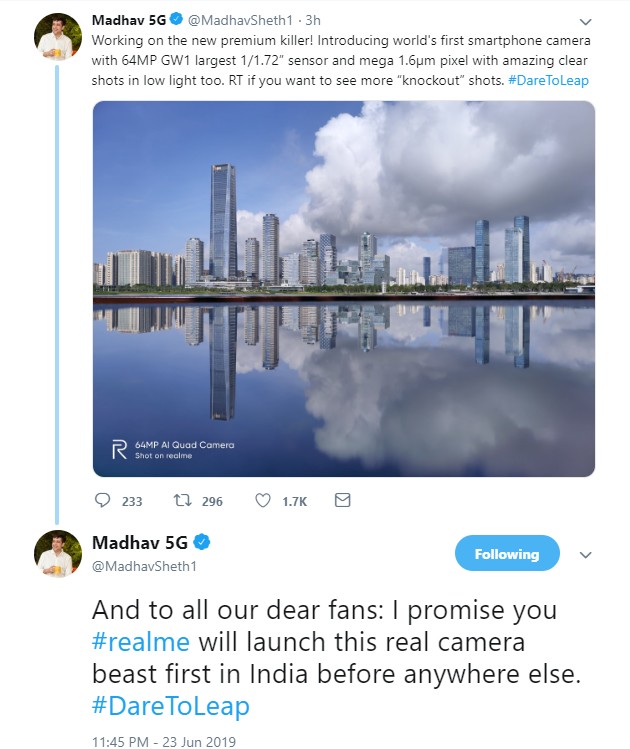 De manière plus officielle, grâce à un tweet du CEO Madhav Sheth, on apprend que Realme en sera également. On a même droit à un cliché avec le filigrane qui va bien. À voir maintenant si un tel smartphone pourrait rejoindre le Realme 3 Pro en Europe. Une chose est sûre concernant la commercialisation : le marché indien, où la marque a fait ses premiers pas, en aura la primeur. C’est en tout cas la promesse de Madhav Sheth.