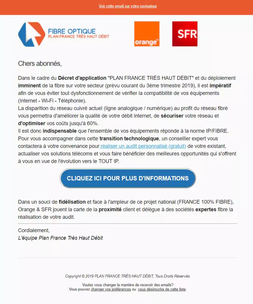 Le Plan France Très Haut Débit annonce qu’une arnaque, faisant croire à un diagnostique fibre, est en cours