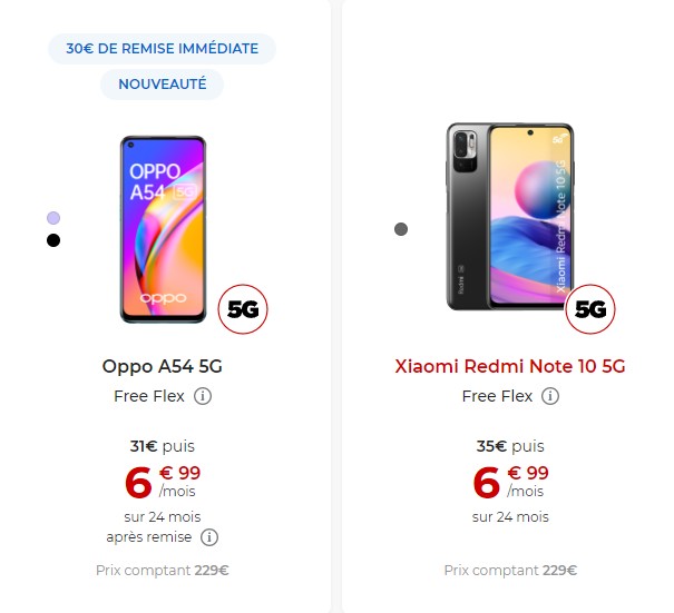 Avec le choc des smartphones, Univers Freebox vous propose un comparatif des smartphones vendus à tarifs équivalents via la boutique de Free Mobile. Il s’agit de vous aider à choisir selon vos attentes, au fil des arrivées et des mouvements de prix. Aujourd’hui, nous opposons les Oppo A54 5G et Xiaomi Redmi Note 10 5G, tous les deux affichés à 229 euros. Ils sont aussi disponibles à 6,99 euros par mois grâce à l’offre Free Flex.