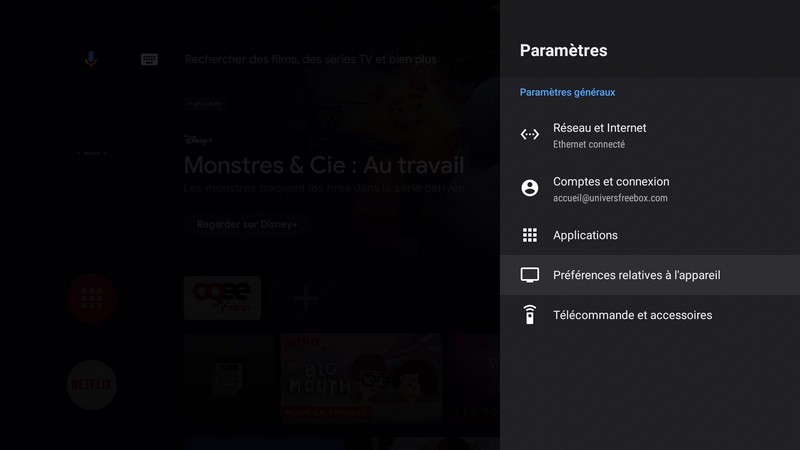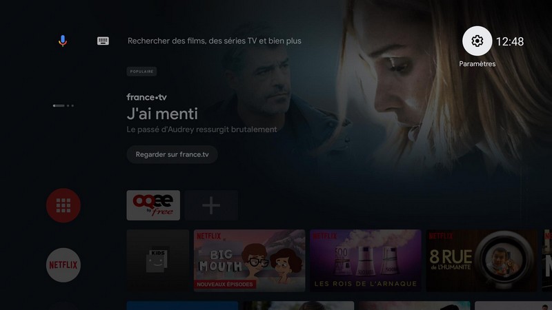 Pour cela, accédez à la Home Android en appuyant sur le bouton en forme de maison sur la télécommande Freebox. Accédez ensuite aux paramètres grâce à la roue dentée en haut à droite de l’écran.