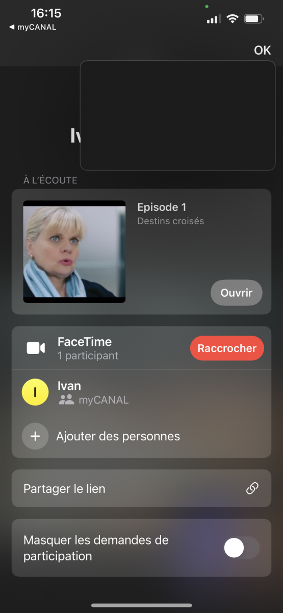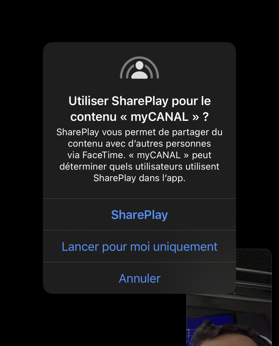 La manipulation est en somme assez simple : il suffit de lancer un appel Facetime avec votre interlocuteur. Une fois la connexion établie, vous pouvez vous rendre directement sur myCanal et lancer votre programme, une infobulle apparaîtra pour vous donner le choix entre utiliser SharePlay ou regarder votre programme par vous même.