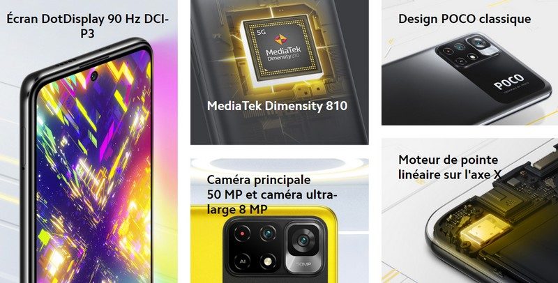 La marque Poco, poussée par Xiaomi, a lancé un Poco M4 Pro 5G équipé d’un SoC MediaTek Dimensity 810 compatible 5G. Il profite aussi d’un écran FHD+ 90 Hz, d’un double capteur photo 50 + 8 Mégapixels et d’une batterie 5 000 mAh supportant la charge 33 Watts. Le Poco M4 Pro 5G coûte 229,90 euros en version 4 + 64 Go ou 269,90 euros en version 6 + 128 Go. Ces deux configurations s’affichent même à 199,90 et 219,90 euros dans le cadre du lancement.