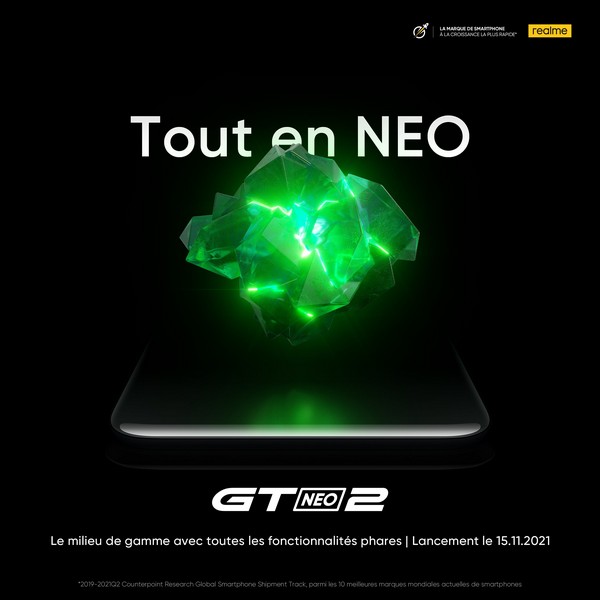 Présenté en septembre dernier, le Realme GT Neo2 s’apprête à débarquer en Europe. La marque chinoise donne en effet rendez-vous le 15 novembre, soit lundi. Des fuites suggèrent des prix de 449,99 euros pour un modèle 8/128 Go et 549,99 euros pour un modèle 12/256 Go. Pour rappel, le Realme GT Neo2 s’équipe d’un SoC Snapdragon 870, d’un écran AMOLED FHD+ 120 Hz, d’un triple capteur photo 64 + 8 + 2 Mégapixels, d’une batterie 5 000 mAh et d’une charge 65 Watts.