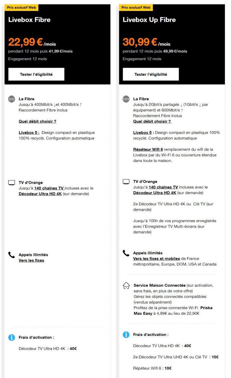 L’offre Livebox Fibre propose des débits jusqu’à 400 Mbit/s en émission comme en réception, les appels illimités vers les fixes et jusqu’à 140 chaines TV avec un décodeur Ultra HD 4K (40 euros). L’offre Livebox Up Fibre permet de passer à des débits jusqu’à 2 Gbit/s en réception et jusqu’à 600 Mbit/s en émission. Elle ajoute aussi les appels illimités vers les mobiles, tout en donnant accès à un deuxième décodeur (10 euros), à un répéteur Wi-Fi 6 (10 euros) et au service maison connectée. Les deux offres sont soumises à un engagement de 12 mois et fournies avec la Livebox 5.