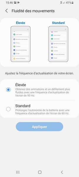 L’écran 6,6 pouces du Galaxy A22 5G coche certaines cases : une définition Full HD+ et un taux de rafraîchissement 90 Hz. Il fait en revanche l’impasse sur l’AMOLED avec ses belles couleurs et ses noirs profonds. Il opte aussi, comme indiqué plus haut, pour l’encoche goutte d’eau moins discrète que le poinçon pour accueillir la caméra frontale. Depuis les réglages, on se voit proposer le choix entre fréquence d’actualité standard ou élevée, un mode confort visuel et un mode sombre.