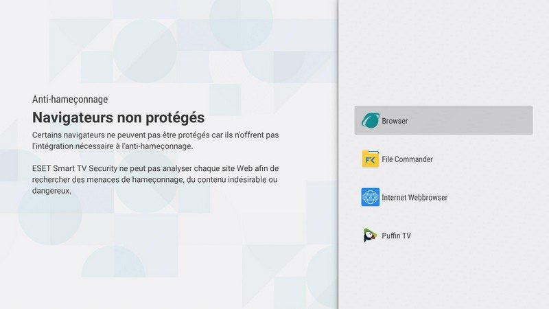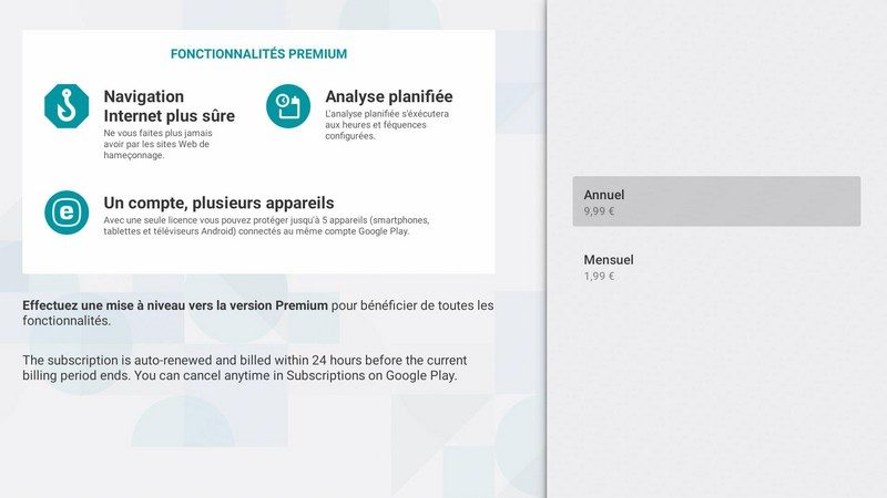 Légère et facile à prendre en main, l’application Eset Smart TV Security se révèle en plus abordable que ce soit à l’année ou au mois. Un coût encore plus acceptable sachant qu’il permet de protéger jusqu’à 5 appareils incluant smartphones et tablettes. Avant de l’adopter, vous aurez même un mois pour l’essayer gratuitement. Autant ne pas se priver si vous utilisez pleinement votre player Freebox, au-delà du seul service TV. Dommage maintenant qu’il ne prenne pas en charge davantage de navigateurs pour la partie anti-hameçonnage.