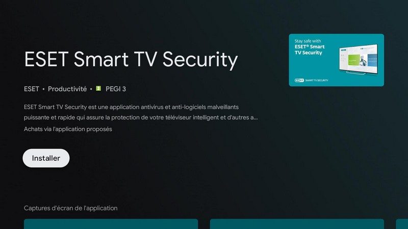 Pour commencer, il va falloir télécharger l’application Eset Smart TV Security depuis le Play Store de Google. L’application pèse moins de 20 Mo et la dernière mise à jour estampillée 1.5.1.0 remonte au 24 novembre 2020.