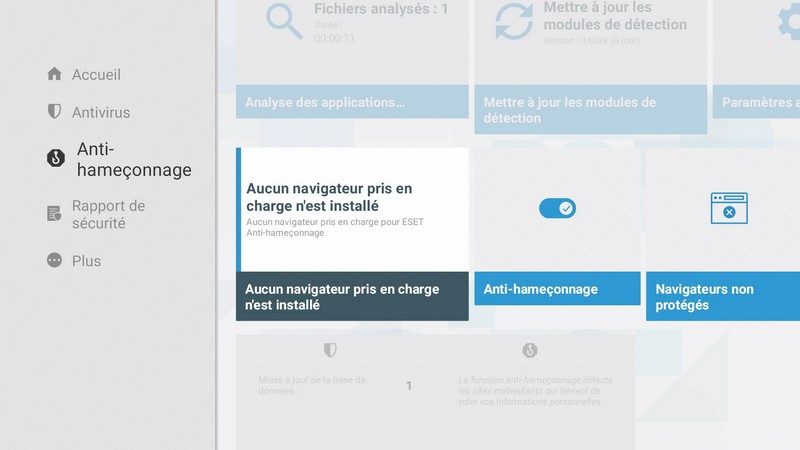 Au niveau de l’interface, Eset Smart TV Security ne réinvente pas la roue, optant pour une barre latérale de navigation à gauche et une partie restante de l’écran dédiée aux contenus. La barre latérale donne accès à l’antivirus, à l’anti-hameçonnage, au rapport de sécurité et aux paramètres.