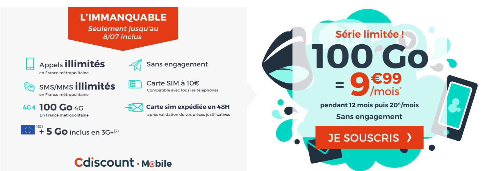 Jusqu’au 08 juillet inclus, Cdiscount Mobile brade son forfait mobile 100 Go, qui se retrouve ainsi à 9,99 euros au lieu de 20 euros durant les 12 premiers mois. La carte SIM, payable à la commande, coûte 10 euros.