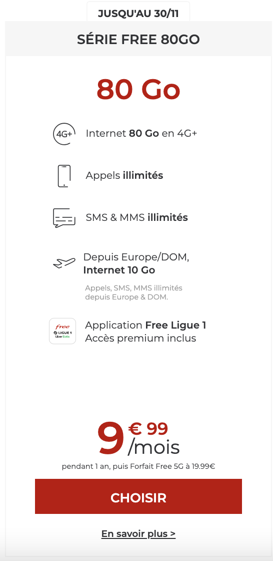 Deux offres alléchantes. Après avoir lancé le 15 novembre une nouvelle vente privée sur Veepee à savoir un forfait 70 Go à 8,99€/mois valable à vie, Free Mobile propose dès aujourd’hui et ce jusqu’au 30 novembre, une offre Série Free comprenant 80 Go en France métropolitaine et 10 Go à l’étranger, à 9,99€/mois soit 1 euro de moins que précédemment pour plus de données en roaming. Au-delà de la première année, les abonnés basculeront automatiquement sur le nouveau Forfait Free 5G 150 Go à 19,99 euros par mois. Cette stratégie semble payer puisque l’opérateur a recruté au total pas moins de 120 000 nouveaux abonnés lors du troisième trimestre en faisant jeu égal avec Orange. De quoi se relancer par la même occasion dans la course aux clients.