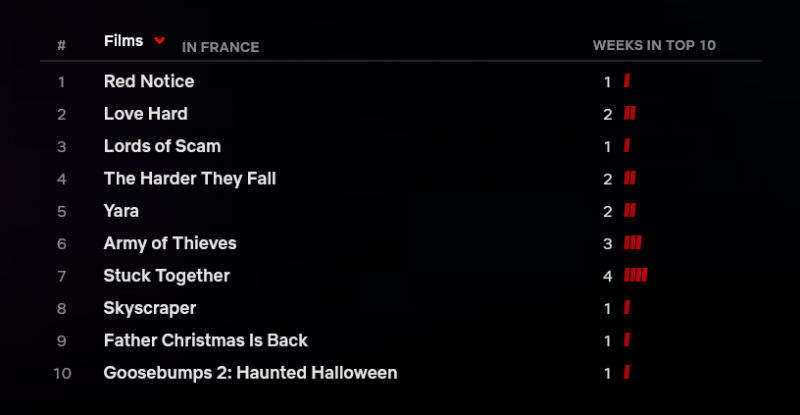 Le classement est actualisé chaque mardi et pour ceux voulant avoir un classement plus local, Netflix publie également deux top 10 films et séries dans 90 pays différents, dont la France bien sûr. Cependant, pour les classements nationaux, les heures regardées ne sont pas montrées et seul le nombre de semaines passées dans le top 10 est dévoilé.