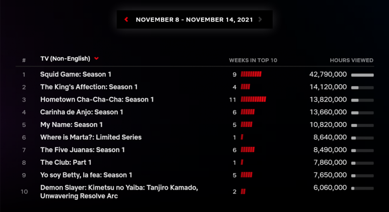 Ce nouvel outil vient en complément des Top 10 quotidiens déjà présentés sur l’interface de la plateforme de SVOD et se base tout simplement sur le nombre d’heures visionnées pour chaque programme. Si le site web est actuellement disponible uniquement en anglais et espagnol, pas de panique, le classement est bien assez clair pour que tout le monde s’y retrouve. Plusieurs top 10 sont proposés, avec des classements à l’échelle mondiale proposant au choix : les films anglophones, séries anglophones, films non anglophones et séries non anglophone. Pour chaque liste, Netflix affiche les heures visionnées pendant la semaine écoulée pour chaque titre.. De quoi intéresser ceux désirant s’aventurer dans les contenus internationaux et sortir des sentiers battus.