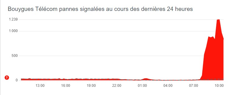 Depuis ce matin, de nombreux abonnés Bouygues Telecom rapportent des dysfonctionnements. D’après l’outil DownDetector, les problèmes ont commencé à gagner en ampleur après 8h00, avec un pic aux alentours de 10h00.