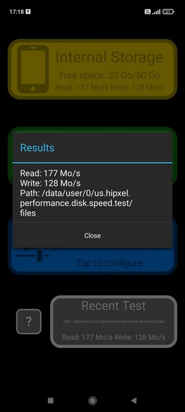 La mémoire interne du Xiaomi Redmi 10 ne fait pas d’étincelles. L’outil Disk Speed vient d’ailleurs le confirmer : 128 Mo/s en écriture et 177 Mo/s en lecture. À défaut d’apporter de la fluidité en toutes circonstances, la mémoire interne peut être étendue de 512 Go, grâce à un emplacement MicroSD dédié. De quoi éviter de se sentir à l’étroit trop rapidement.
