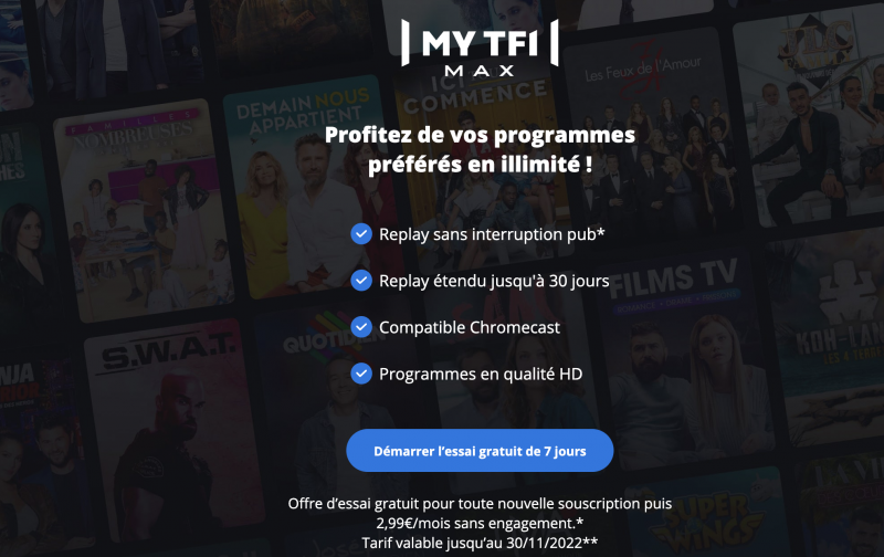 Top départ pour MyTF1 Max. Après un premier lancement sur les Livebox d’Orange dans une offre intégrant aussi 6PlayMax, le nouveau service de replay étendu payant et sans interruption publicitaire de TF1 voit le jour sur de nouveaux supports, à savoir les smartphones, tablettes, ordinateurs et sur TV via Chromecast. L’offre inclut également un replay étendu (J+30 au lieu de J+7), une accessibilité dans toute l’Europe et les programmes en qualité HD. Côté prix, MyTF1 Max est proposé au tarif de 2,99€ par mois au lieu de 3,99€, ou à 29,99€ par an au lieu de 39,99€. Ce tarif découverte est valable jusqu’au 30 novembre, les 7 premiers jours sont offerts. Reste à savoir si ce service rattrapage intégrera les box d’autres opérateurs.