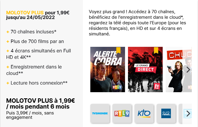 La formule Molotov Plus est en promotion avec au programmes plus de 70 chaînes, la 4K et 700 films pour moins de 2€/mois pendant six mois.