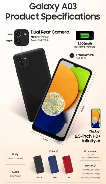 De son côté, Samsung a annoncé un modèle d’entrée de gamme baptisé Galaxy A03. Il embarque un processeur octa-core 1,6 GHz avec 3 ou 4 Go de RAM, un écran IPS 6,5 pouces HD+, un double capteur photo 48 + 2 Mégapixels au dos (principal + portrait), une caméra frontale 5 Mégapixels et une batterie 5 000 mAh. La firme sud-coréenne n’a pas encore donné d’informations concernant la distribution.