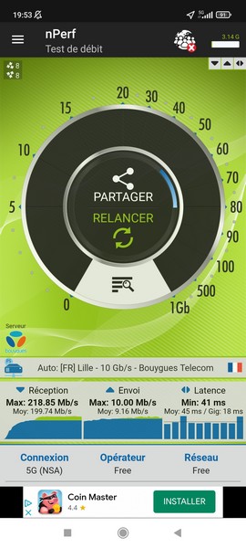 Comme son nom l’indique, le Poco M4 Pro 5G est compatible avec la 4G et la 5G. Il supporte la bande 700 MHz chère aux abonnés Free Mobile. Comme à l’accoutumée, nous avons utilisé les outils nPerf et RNC Mobile pour mesurer les débits en intérieur comme en extérieur.