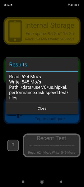 La mémoire interne de 64 ou 128 Go profite d’une extension par MicroSD allant jusqu’à 1 To. Mais quid des performances de celle-ci ? L’outil Disk Speed nous indiquait 545 Mo/s en écriture et 624 Mo/s en lecture. Plutôt pas mal pour un smartphone sous la barre des 250 euros. Honnêtement, nous n’en attendions pas tant.