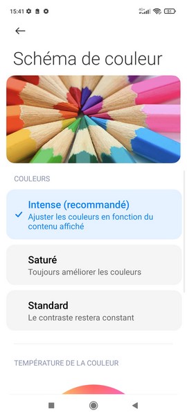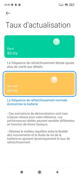L’écran du Poco M4 Pro 5G s’annonce taillé pour le multimédia avec sa diagonale de 6,6 pouces, sa définition Full HD+, son taux de rafraîchissement jusqu’à 90 Hz et son poinçon. La marque a dû faire des choix pour contenir les coûts, n’intégrant ainsi pas la technologie AMOLED dans le cahier des charges. Depuis les paramètres, on aura accès aux réglages du schéma de couleur et de la fréquence de rafraîchissement, mais également à des mode sombre et mode lecture (ton plus chaud). Du grand classique.