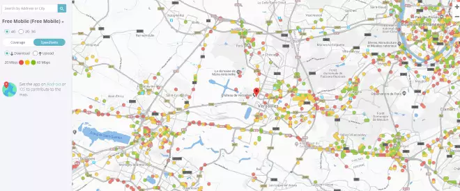 Selon les résultats des tests effectués par les abonnés Free Mobile, les zones rouges ont un débit inférieur à 20Mb/s, pour les zones jaunes le débit est compris entre 20 et 60Mb/s et pour les zones vertes le débit est au dessus de 60Mb/s.