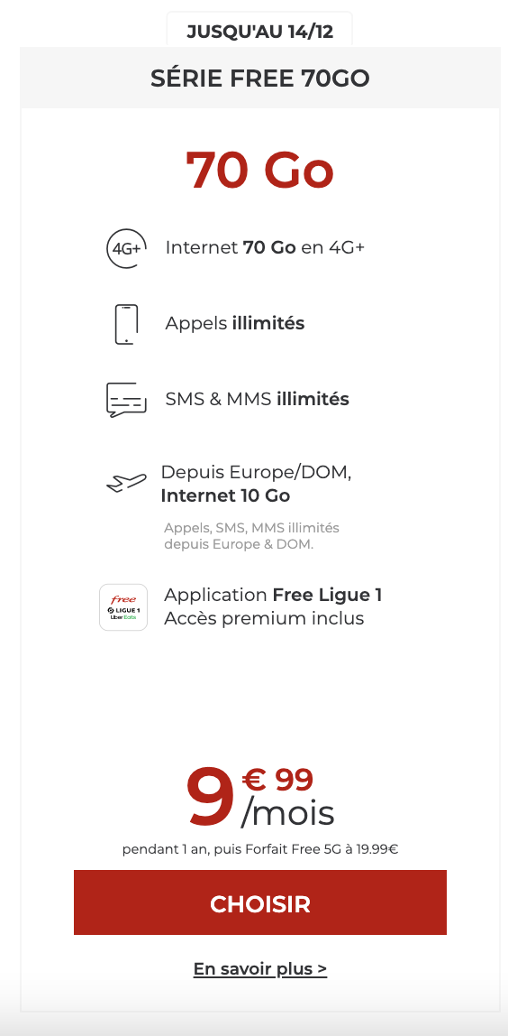 Après avoir baissé le 17 novembre de 1 euros le prix de son offre intermédiaire, Free Mobile décide aujourd’hui de proposer moins de data dans son offre, soit 70 Go contre 80 Go précédemment. Cette nouvelle formule disponible jusqu’au 14 décembre, comprend aussi 10 Go de données à l’étranger et le service Free Ligue 1 inclus. Au-delà de la première année, les abonnés basculeront automatiquement sur le nouveau Forfait Free 5G 150 Go à 19,99 euros par mois.