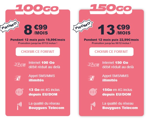 Disponible jusqu’au 6 décembre 2021, un forfait 150 Go (débit réduit au-delà) s’annonce à 13,99 euros par mois pendant 12 mois, puis 22,99 euros par mois. Il comprend aussi les appels, SMS et MMS en illimité, ainsi que 15 Go de data en roaming depuis l’Europe et les DOM. Proposé jusqu’au 7 décembre 2021, un forfait prévoit les appels, SMS et MMS illimités, 100 Go de data depuis la France et 13 Go en roaming. Il coûte 8,99 euros par mois pendant 12 mois, puis 19,99 euros par mois. Ces deux forfaits sont sans engagement. La carte SIM triple découpe coûte 10 euros et est à payer au moment de la commande.
