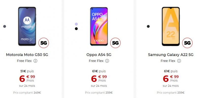 Avec le choc des smartphones, Univers Freebox vous propose un comparatif des smartphones vendus à tarifs équivalents via la boutique de Free Mobile. Il s’agit de vous aider à choisir selon vos attentes. Aujourd’hui, nous opposons les Motorola Moto G50 5G, Oppo A54 5G et Samsung Galaxy A22 5G, affichés à 249, 259 et 259 euros au comptant. Ils sont aussi disponibles à 6,99 euros par mois via l’offre de location avec option d’achat Free Flex.