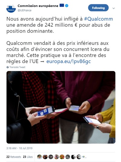 La Commission européenne a ainsi infligé une amende de 242 millions d’euros à Qualcomm. Elle explique le montant de l’amende par le fait que "le comportement de Qualcomm portait gravement préjudice à la concurrence" et qu’il "réduisait les possibilités de choix pour les consommateurs". Alors qu’elle peut décider d’une amende allant jusqu’à 10 % du chiffre d’affaires, la Commission européenne souligne que cela représente 1,27 % du CA du géant américain en 2018. Qualcomm a évidemment fait appel de la décision.