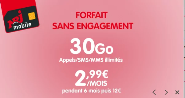 Il s’agit d’un forfait sans engagement Appels/SMS/MMS illimités (3h max/appel et 129 destinataires différents max/mois) avec 30 Go de data pour un tarif de 2.99€/mois. Toutefois, ce dernier remonte vite, puisqu’il passe à à 12€/mois au bout de 6 mois, toujours pour 30Go de data.