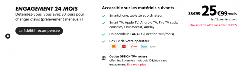 Cette promo est disponible sur tous les supports, y compris les Freebox, pour un montant mensuel de 25.99€ avant de rebasculer à 35.99€/mois. A noter cependant, pour en bénéficier il est nécessaire de s’engager durant 24 mois, vous disposez de 30 jours pour changer d’avis.