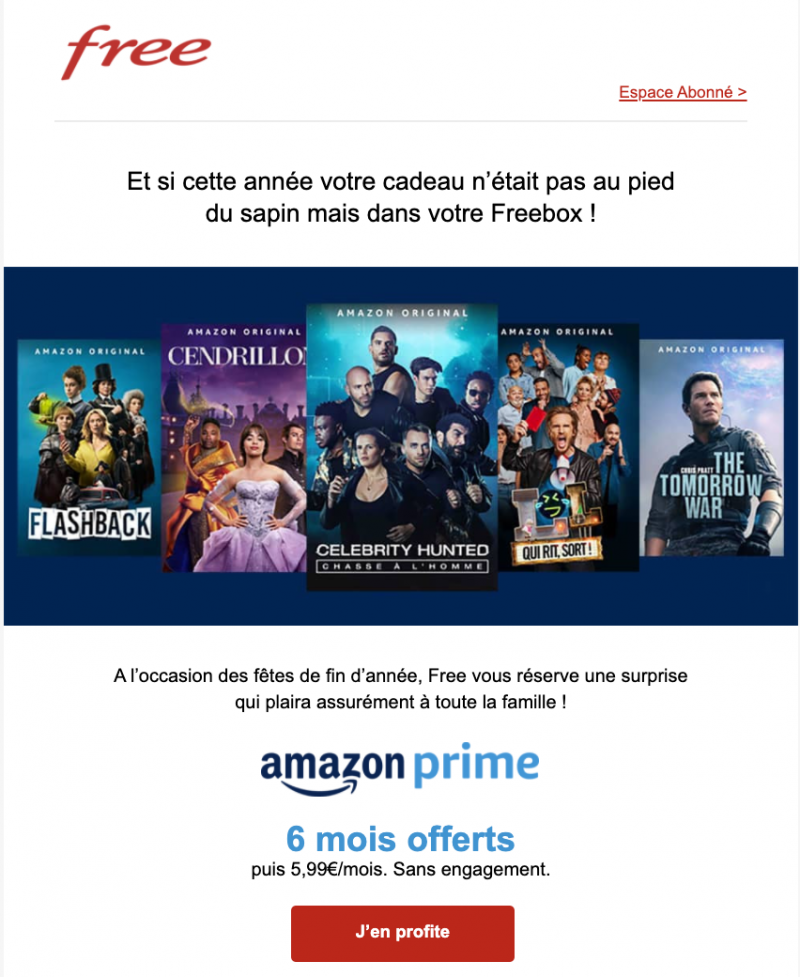 “Et si cette année votre cadeau n’était pas au pied du sapin mais dans votre Freebox”, à l’occasion des fêtes de fin d’année, Free offre à tous ses abonnés Freebox Révolution anciens comme nouveaux, 6 mois d’abonnement à Amazon Prime et tous ses avantages comme Prime Vidéo, la livraison gratuite et rapide ou encore Amazon Music Prime. Après une première annonce la semaine dernière, l’opérateur envoie actuellement un mail aux abonnés concernés pour les informer de cette offre alléchante, en leur permettant d’en profiter et d’y souscrire directement via son courriel.