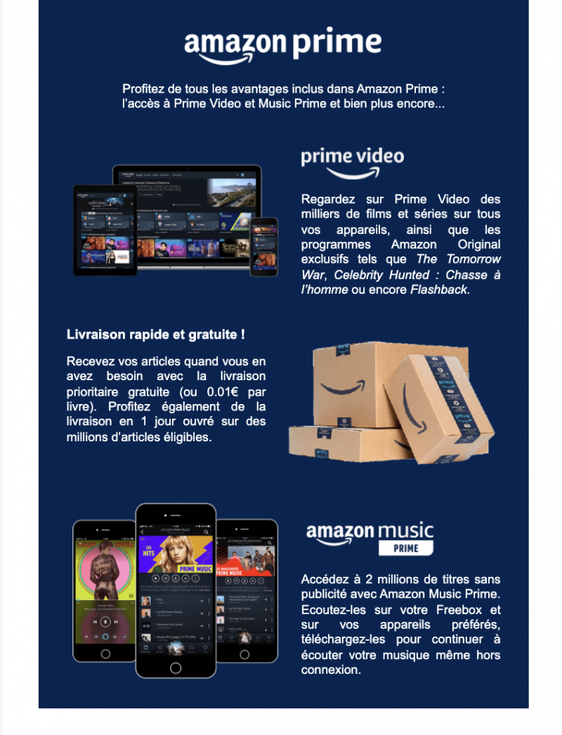 Dans un nouveau courriel, Free permet à ses abonnés Freebox Révolution de profiter de 6 mois offert à Amazon Prime, sans engagement (puis 5,99€/mois) en quelques clics.