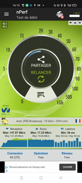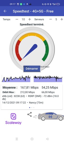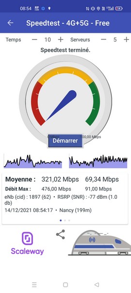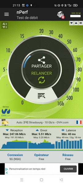 Le Realme GT Neo 2 supporte la 4G et la 5G sur la bande de fréquences 700 MHz, sur laquelle a beaucoup misé Free pour le déploiement de ses réseaux. Il propose également un fonctionnement dual-SIM, grâce à deux logements Nano-SIM, permettant ainsi de gérer un numéro personnel et un numéro professionnel depuis un même terminal. Nous avons, comme à chaque fois, réalisé des mesures avec les outils gratuits nPerf et RNC Mobile.