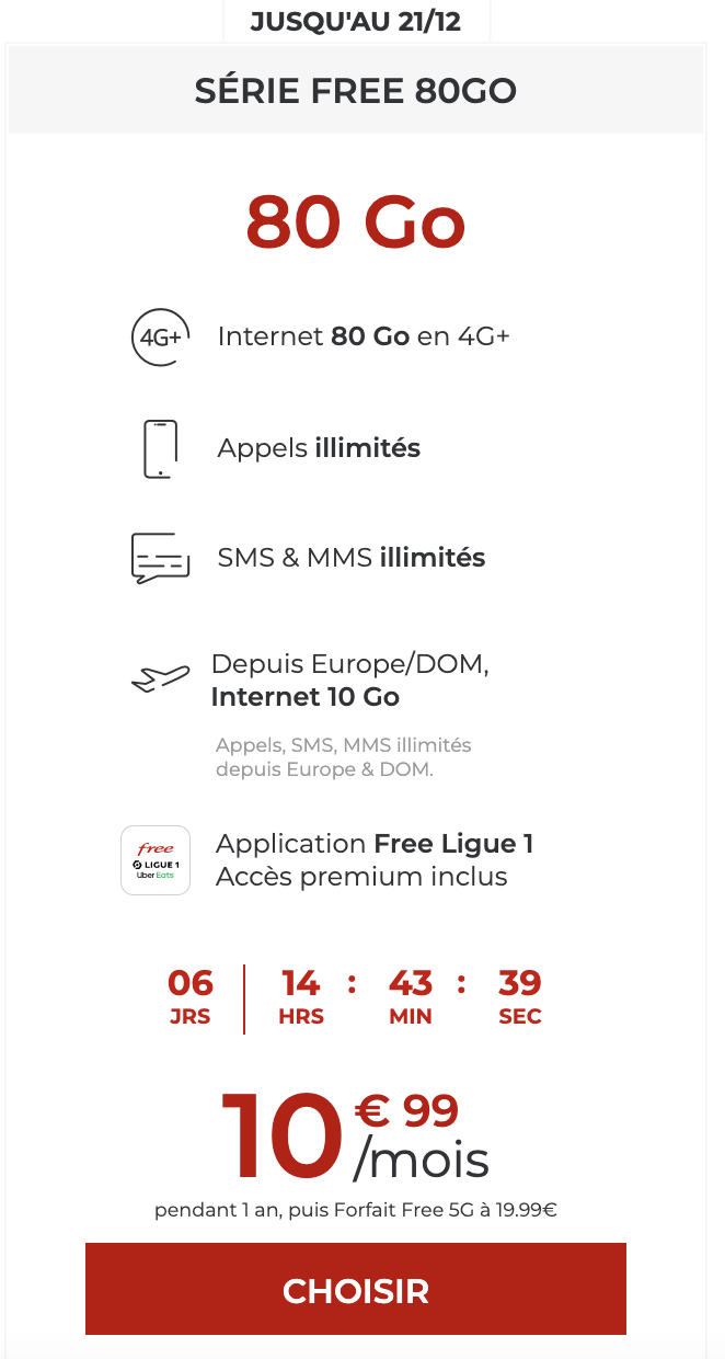 Cette formule comprend aussi 10 Go de données à l’étranger et le service Free Ligue 1 inclus. Au-delà de la première année, les abonnés basculeront automatiquement sur le nouveau Forfait Free 5G 150 Go à 19,99 euros par mois.