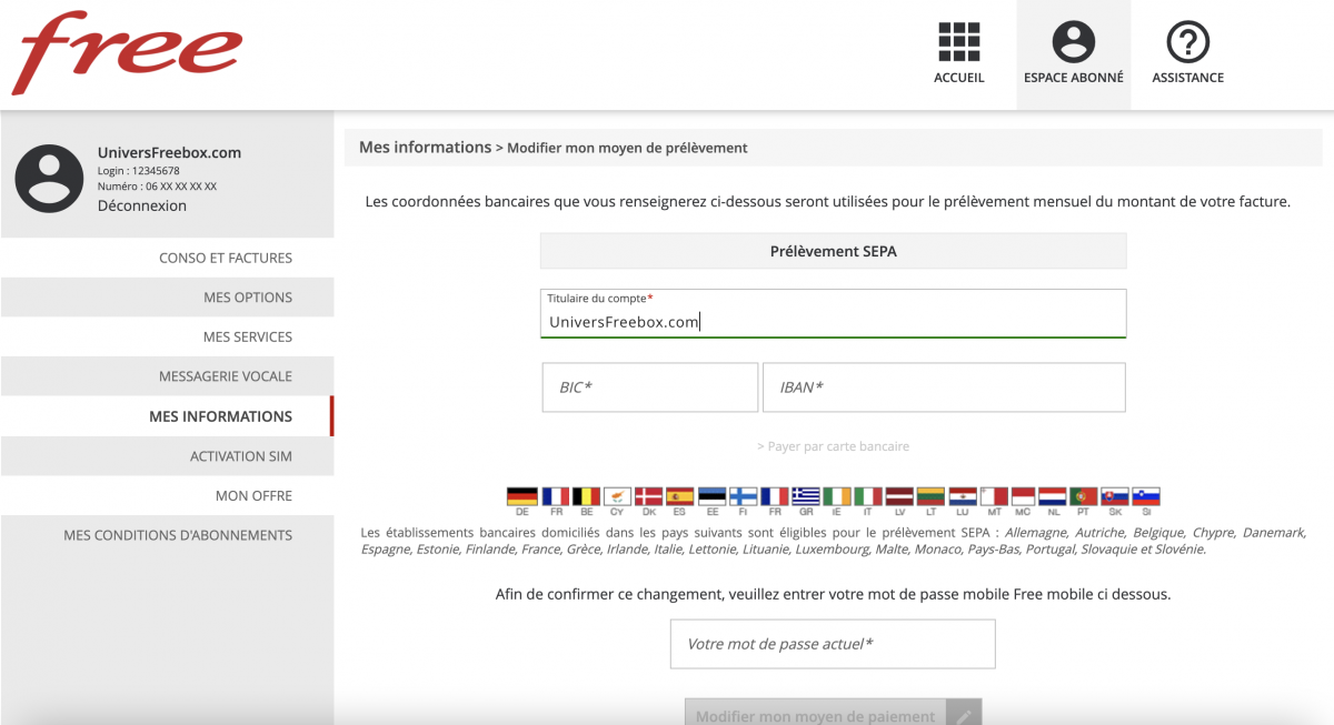 Free propose deux moyens de paiement, par carte bancaire ou par RIB. Pour pouvoir modifier son moyen de paiement cela est assez simple il suffit de se rendre sur son espace abonné mobile.free.re, puis ” Mes Informations” et ensuite “Mon Moyen de Paiement”.